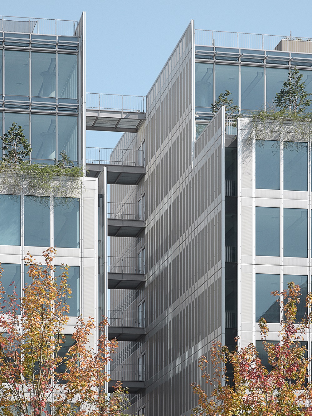 尽管这些建筑的大面积预制化幕墙共享了一种通用语言,但它们的尺度与形式经微妙的控制,为园区所创造的城市空间增添了趣味和丰富性。