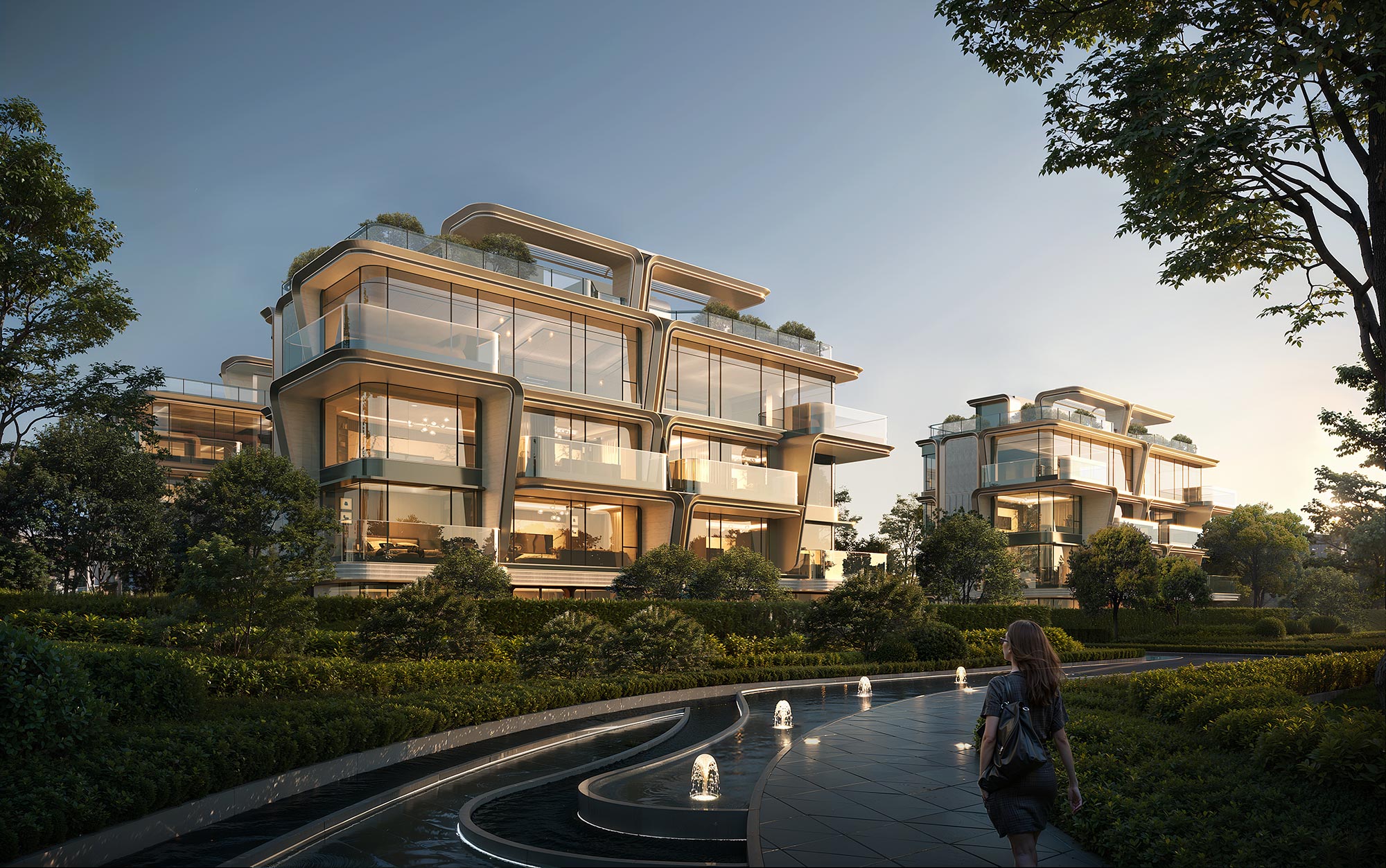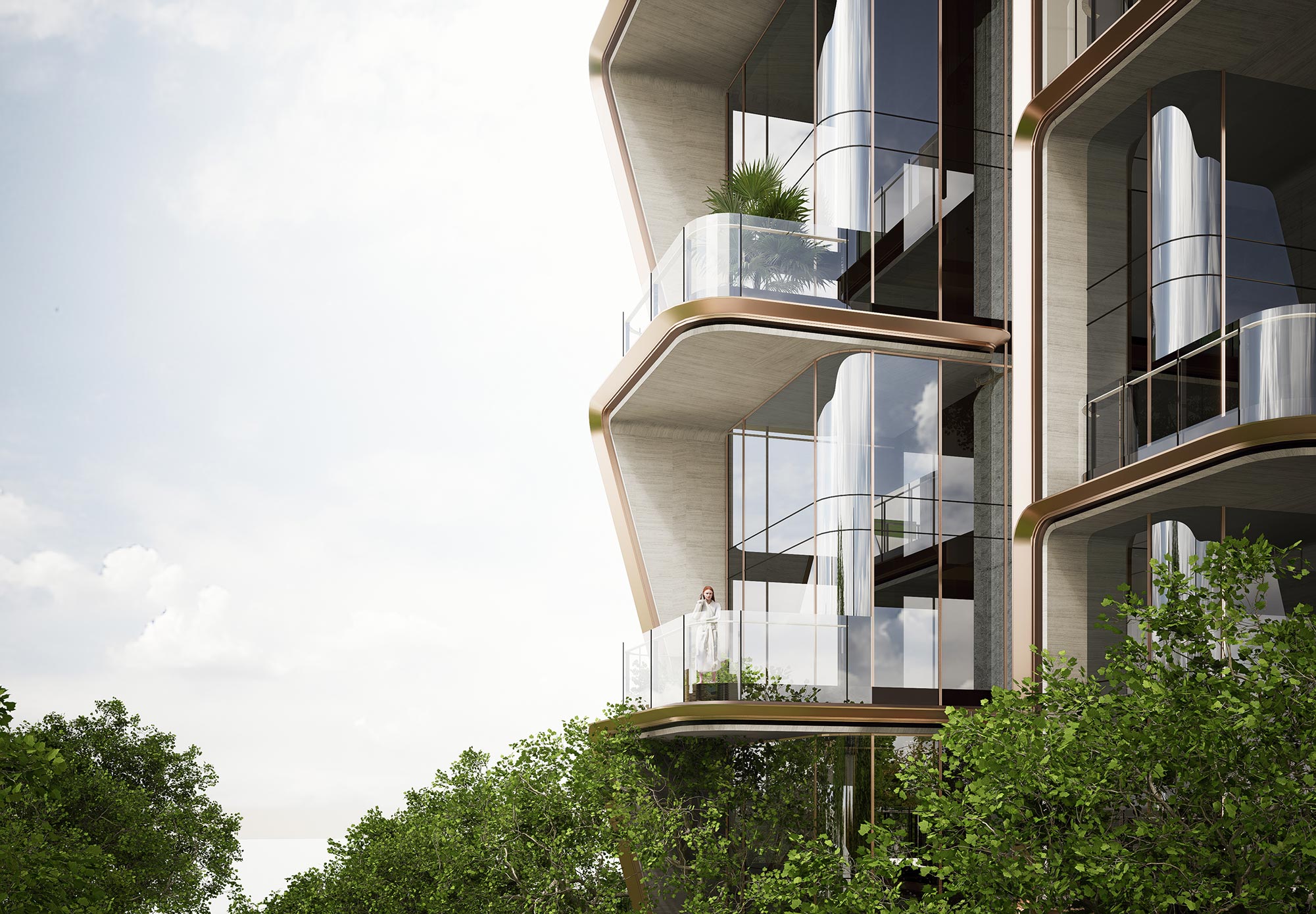 嘉佰道·南京的造型语言,突破了传统居住建筑规整的立面框架。设计以“绽放”作为造型母题,通过高度统一的功能解题与形式创新,整合了传统四代住宅难以解决的隐私保护与视线平权的难题,将水平露台与竖向视线管理构件,通过花瓣绽放的生长意向进行整合统一,构建了独一无二的视觉辨识力。交替生长,舒展自然的艺术之花,兼具韵律的美感和节奏的变化,在展现现代科技住宅视觉张力的同时,赋予了建筑动态的空间形式与艺术气质。绽放的形式语言,同时赋予金属、石材、玻璃一系列建筑材料,以新的表现力和质感效果,让光影和时间共同参与到建筑生长绽放的过程。