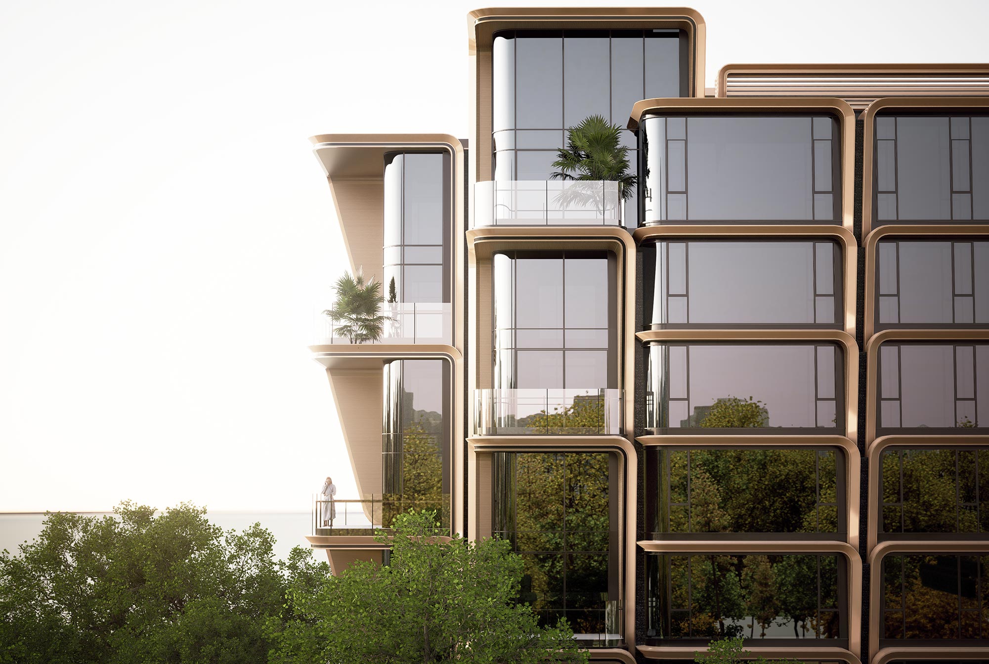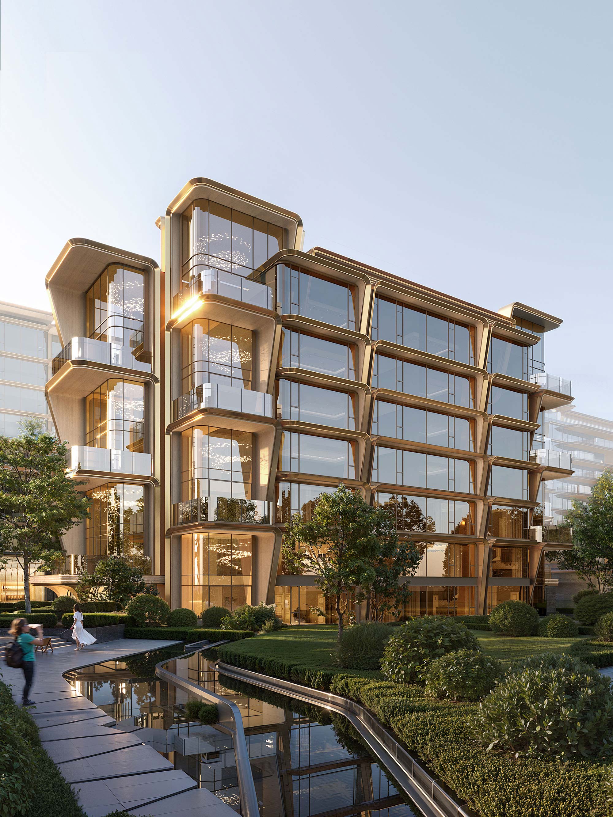 The architectural language of Grand Palais · Nanjing breaks through the conventional, rigid façade framework of traditional residential buildings. Taking "blooming" as its design motif, the project achieves a high degree of unity between functional solutions and formal innovation. It integrates the often-conflicting demands of privacy protection and equitable sightlines—typically challenging in fourth-generation residences—by unifying horizontal terraces and vertical visual management elements through the imagery of blooming petals. This creates a unique visual identity. Like an artistic flower that alternates in growth, stretching out naturally with rhythmic beauty and dynamic variation, the design not only showcases the visual impact of modern technological residences but also endows the architecture with dynamic spatial forms and artistic character. The blooming formal language also gives new expressive power and textural effects to materials such as metal, stone, and glass, allowing light, shadow, and time to participate in the process of the building's growth and blossoming.