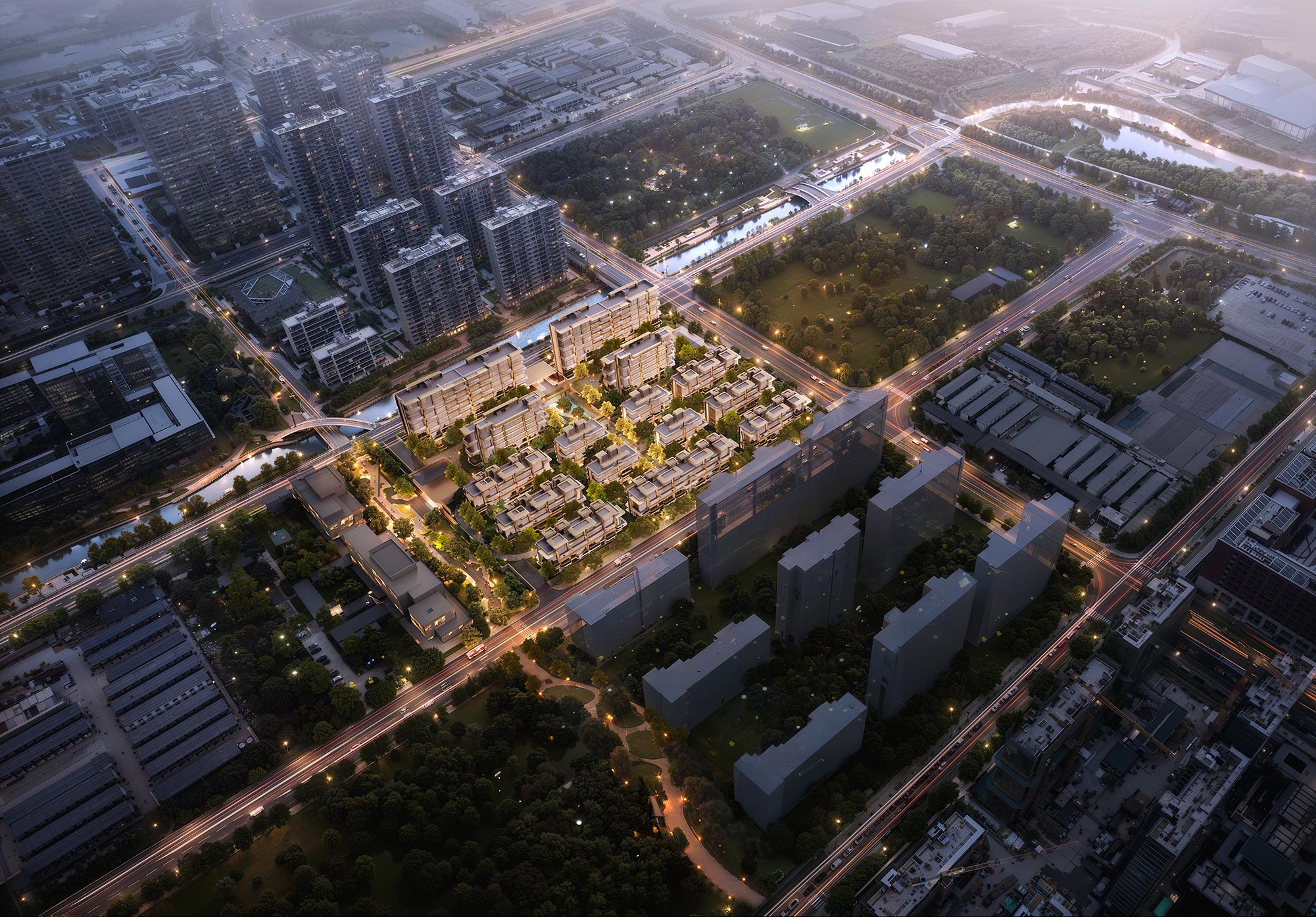 Located in the core area of Qinhuai District, the master plan maximizes the site’s density potential. While creating a symmetrical and elegant spatial layout, it incorporates diverse product types such as stacked villas and flat-style villas, achieving rich volumetric layering and a natural transition in building heights. This approach opens up visual corridors between interior spaces and external landscape resources, creating a complex spatial relationship within a relatively pure master plan.