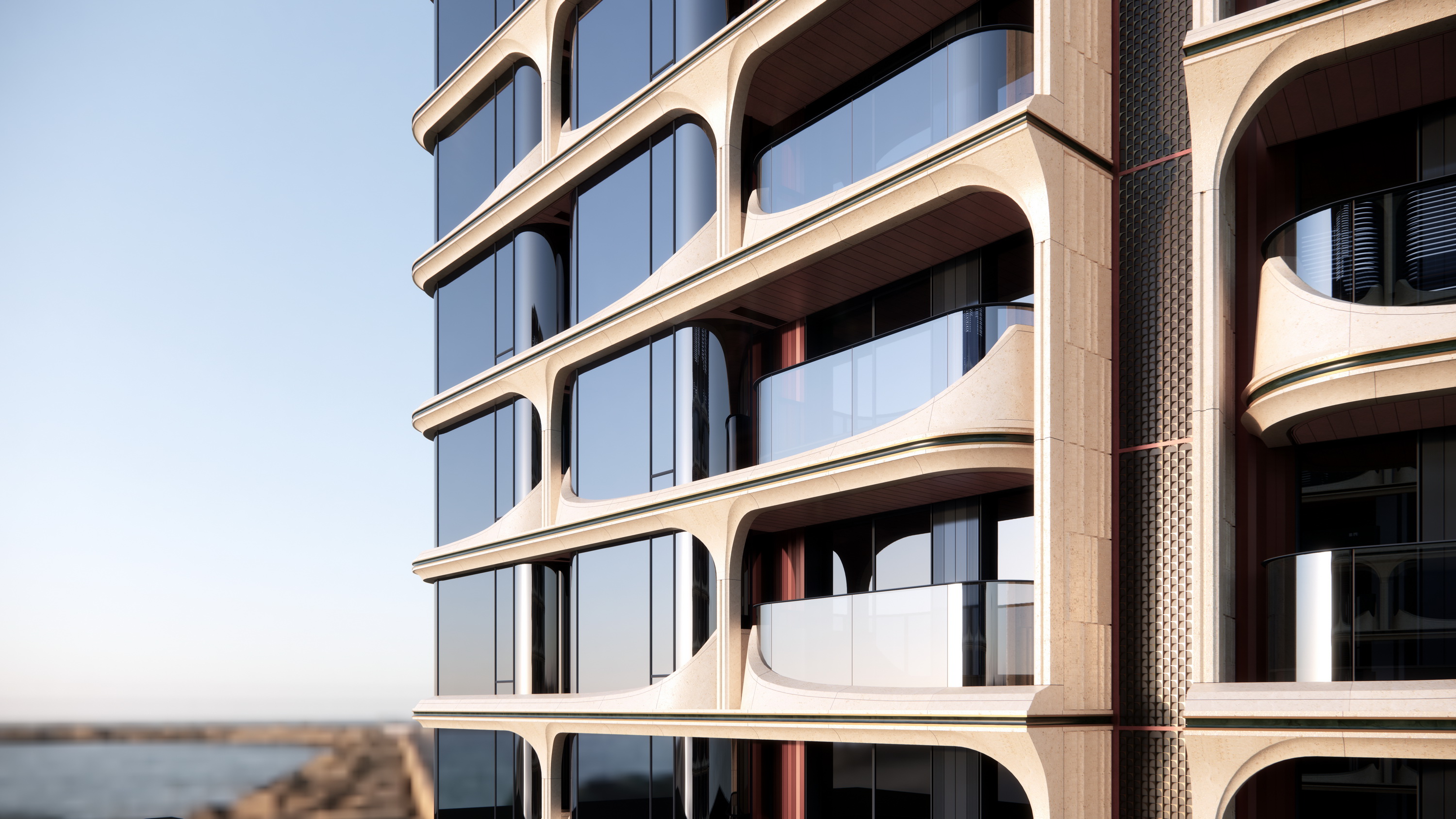 建筑立面以上海市花白玉兰为意象原型,将层叠花瓣抽象为独特的双曲面花瓣表皮。设计解决了自由形态与住宅功能的精准结合难题,起翘弧线与剪力墙对应,在塑造张扬形象的同时,最大限度减少对室内空间的干扰,达成实用性与艺术表现力的平衡。