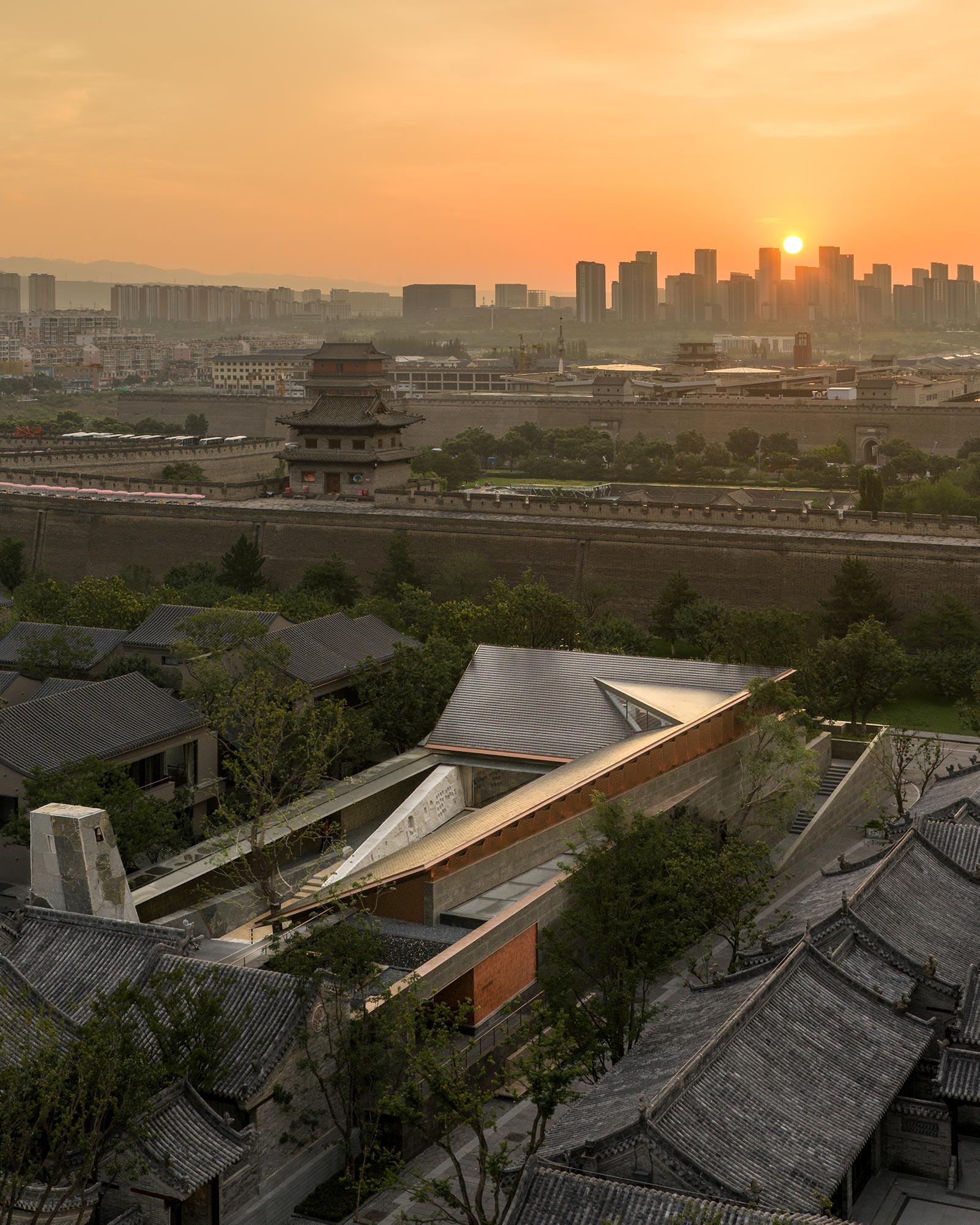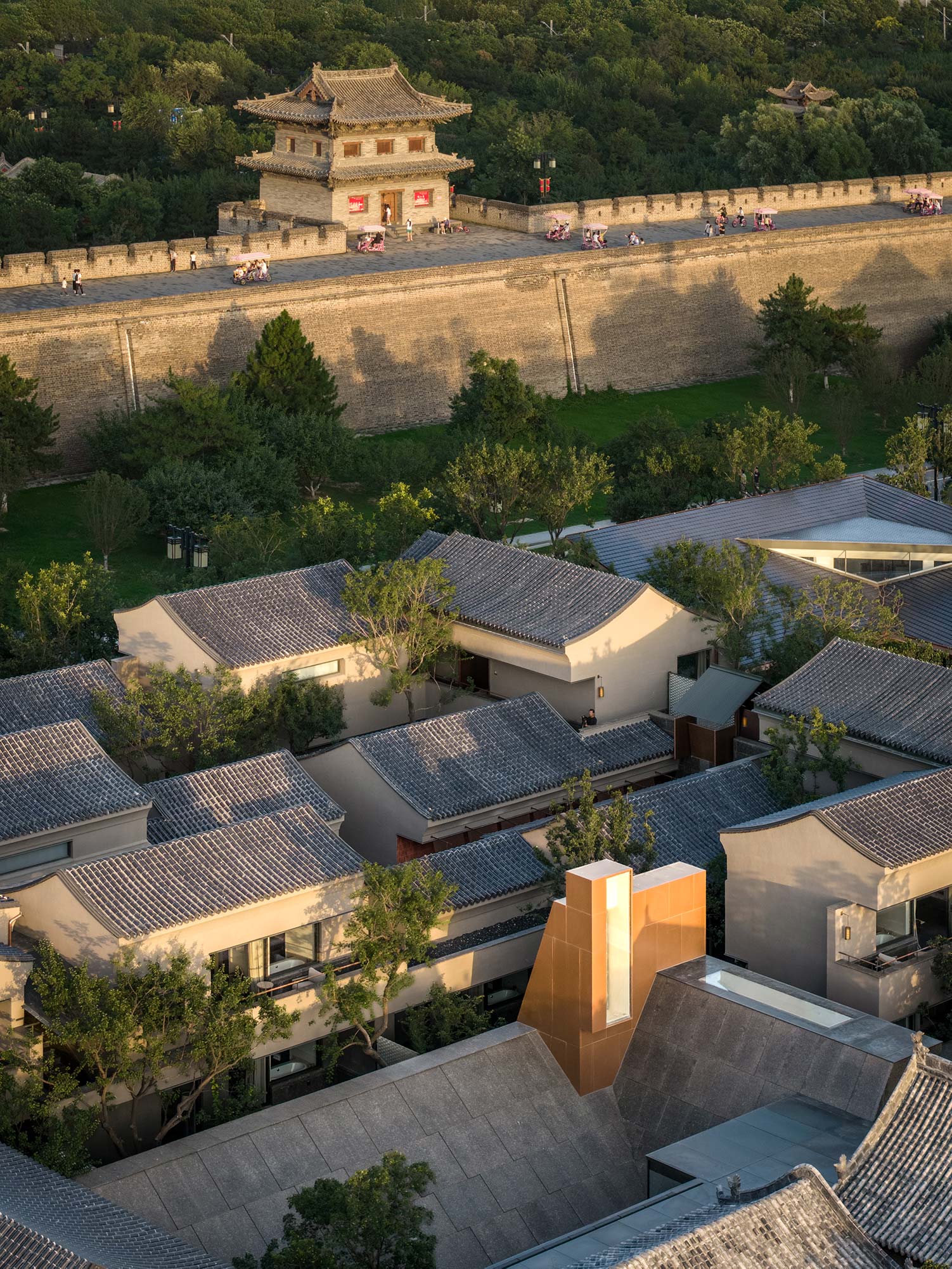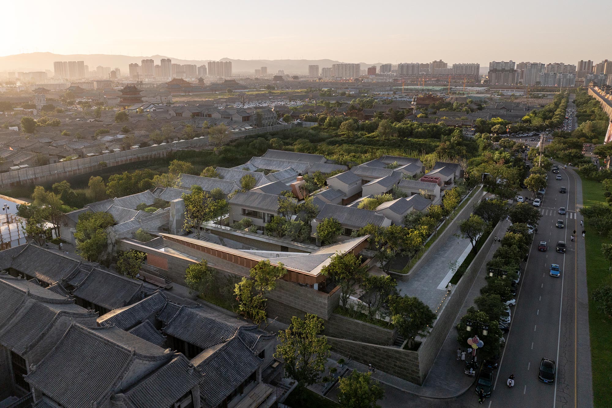 2019年,当酒店最初立项时,在古城蒙尘的表象之下,“四大街、八小巷,七十二条绵绵巷”的棋盘式街巷格局清晰可见,诉说着大同作为中国古代“里坊制”成型之城的历史。在这样的条件下,既下山·大同面对着两个方面的使命:既是为旅客提供体验的场所,也是古城中重要的城市建筑。设计之初,建筑师明确主张:“对于古城肌理,应充分尊重,而非对抗。” 因此,酒店的建筑形态不与相邻街区做雕塑性竞争,而是完全融入古城格局之中,在里坊群落的尺度控制下,寻求内部空间的丰富变化。